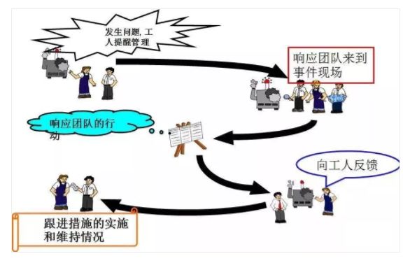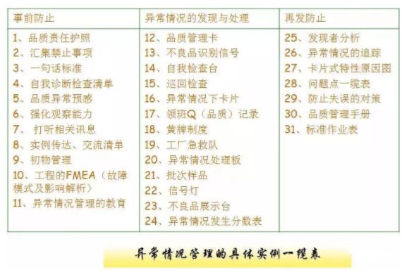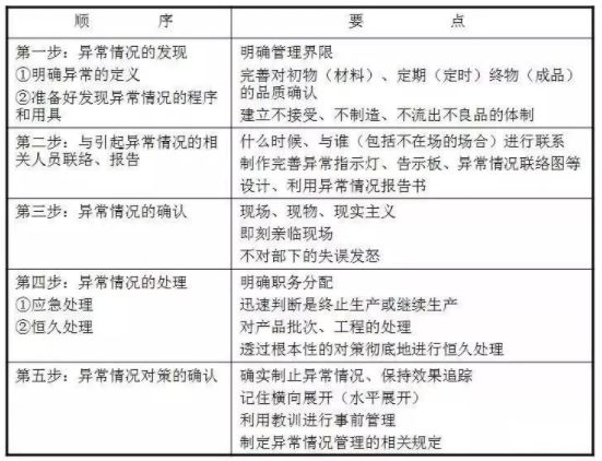 上图:现场管理中,针对车间每天出现的异常,快速应对并及时处理,防止其再发生是很重要的,因此现场管理也称为异常管理。管理的本质就是在顺利的情况下,一旦有什么异常,则尽快地发现并采取措施。
