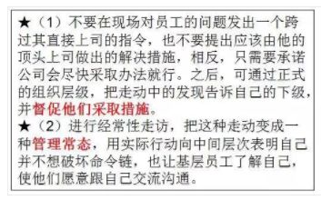 在有等级的组织中,走动式管理经常会冒犯或者冲撞组织的等级链。因此,走访者会遇到这样的困境:既要遵守组织的权责关系和等级秩序,又要在某种程度上抛开这种规矩。对于如何走出这种困境,彼得斯提出了两种可行的方法: