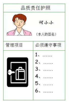 防止异常情况发生的最基本方法还是要每一个人都必须具有责任感,认真完成自己的工作。为了促使每个人都有能自觉地意识到自己的责任,可以制作(品质责任护照)让每个人持有一份工作证。